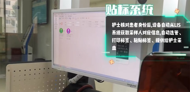 醫(yī)護(hù)人員核對(duì)患者的身份信息,設(shè)備自動(dòng)獲取采樣人對(duì)應(yīng)信息,自動(dòng)選管,打印標(biāo)簽、粘貼標(biāo)簽,提供給醫(yī)護(hù)人員采血。選管、貼標(biāo)、打條碼、出管,護(hù)士只需要做消毒扎針工作就可以了。選擇對(duì)應(yīng)顏色的采血管邊打印對(duì)應(yīng)標(biāo)簽,保留原有的刻度線進(jìn)行貼標(biāo)粘貼。自動(dòng)復(fù)核提供給醫(yī)護(hù)人員使用。醫(yī)護(hù)人員取管確認(rèn)信息后進(jìn)行采血操作,將采完血的樣本放入傳輸系統(tǒng)里面。