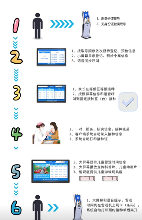 第一步,預(yù)防接種的叫號機(jī)刷身份證取號無身份證觸摸取號兩種方式。第六步,大屏幕名字顯示和語音呼叫,留觀時(shí)間到了后再機(jī)器上刷卡后系統(tǒng)自動打印預(yù)約接種單就可以離開。
