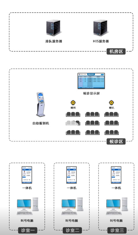 排隊(duì)叫號系統(tǒng)圖,機(jī)房區(qū)由排隊(duì)服務(wù)器和叫號服務(wù)器組成。候診區(qū)由自助報(bào)道一體機(jī),播放喇叭候診顯示屏組成。診室區(qū)由排隊(duì)叫號顯示一體機(jī)和呼叫電腦組成,同時(shí)服務(wù)器顯示屏叫號一體機(jī)都是通過tcp聯(lián)網(wǎng)。