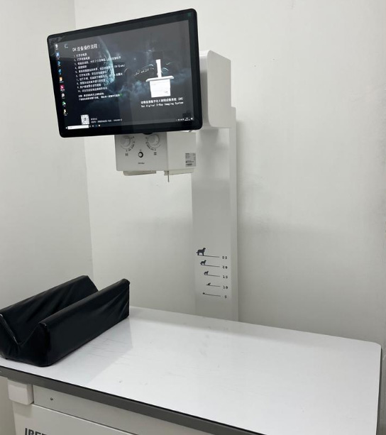 這就是寵物專用的寵物DR影像系統(tǒng),檢查設備非常重要。快速判斷病情DR系統(tǒng)由于它成像快的優(yōu)點,現(xiàn)在已經在寵物醫(yī)院廣泛的使用的儀器設備。都是比較有實力的寵物醫(yī)院??梢栽趧游飫討B(tài)情況下進行DR攝片檢查。DR的作用在臨床中拍片子,可以看有沒骨折、有沒有膀胱石,有幾個胎兒等等,DR的手術床可以活動的方便我們中間去選位置,可以跟這個大小調整位置。鉛衣是做拍攝防護的,選擇拍攝部位,腿部、胸部、前肢等。不同部位的值也是不一樣的。千伏毫秒都不一樣。
