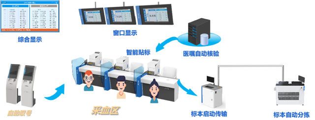 采血流程:患者到窗口采血-掃碼或讀就診卡-核對(duì)檢驗(yàn)項(xiàng)目-打印標(biāo)簽-選擇試管-粘貼試管-護(hù)士采血。人工采血存在問(wèn)題人工選管、打印、粘貼,勞動(dòng)強(qiáng)度大。容易出現(xiàn)人為錯(cuò)誤。貼歪、貼倒(不能識(shí)別)。位置錯(cuò)誤(流水線無(wú)法識(shí)別)。視窗覆蓋(無(wú)法觀察血液情況)??赡艹霈F(xiàn)漏采或多采血。智能采血設(shè)備解決采血人的排隊(duì)難題,智能采血管理系統(tǒng)把采血管的準(zhǔn)備工作自動(dòng)化,縮短等待時(shí)間。采血流程需要全面的優(yōu)化,報(bào)到取號(hào),65歲以上老人優(yōu)先。智能叫號(hào)不需要長(zhǎng)時(shí)間的排隊(duì)。采血管容量大,處理速度快,能有效加快采血速度,提高采血服務(wù)質(zhì)量。自動(dòng)化代替了傳統(tǒng)人工的操作模式。自動(dòng)識(shí)別自動(dòng)貼標(biāo),自動(dòng)標(biāo)本核收。大大的減少人工誤差。也減少繁雜的采血前準(zhǔn)備,系統(tǒng)具有諸多優(yōu)勢(shì),將為客戶(hù)帶來(lái)全新的體檢體驗(yàn)。