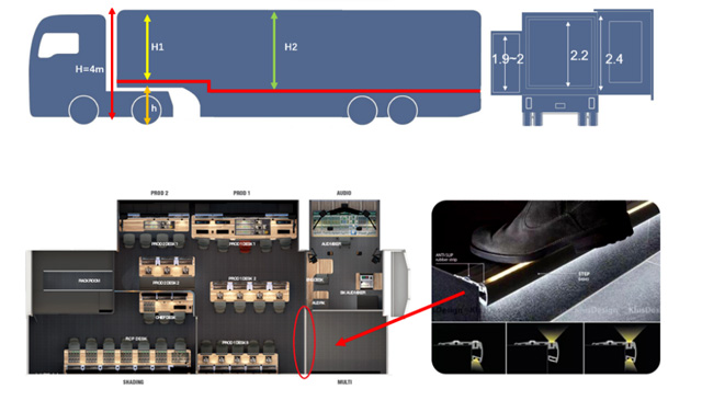 不過采用一些特殊的設(shè)計(jì),是有可能增加內(nèi)高的,比如上文講到的采用鵝頸底盤,內(nèi)外套拉箱形式中內(nèi)套部分內(nèi)高可以達(dá)到1.9~2米;但是鵝頸部分會(huì)有150mm左右的臺(tái)階,為了安全考慮,建議增加提示燈帶等安全措施。